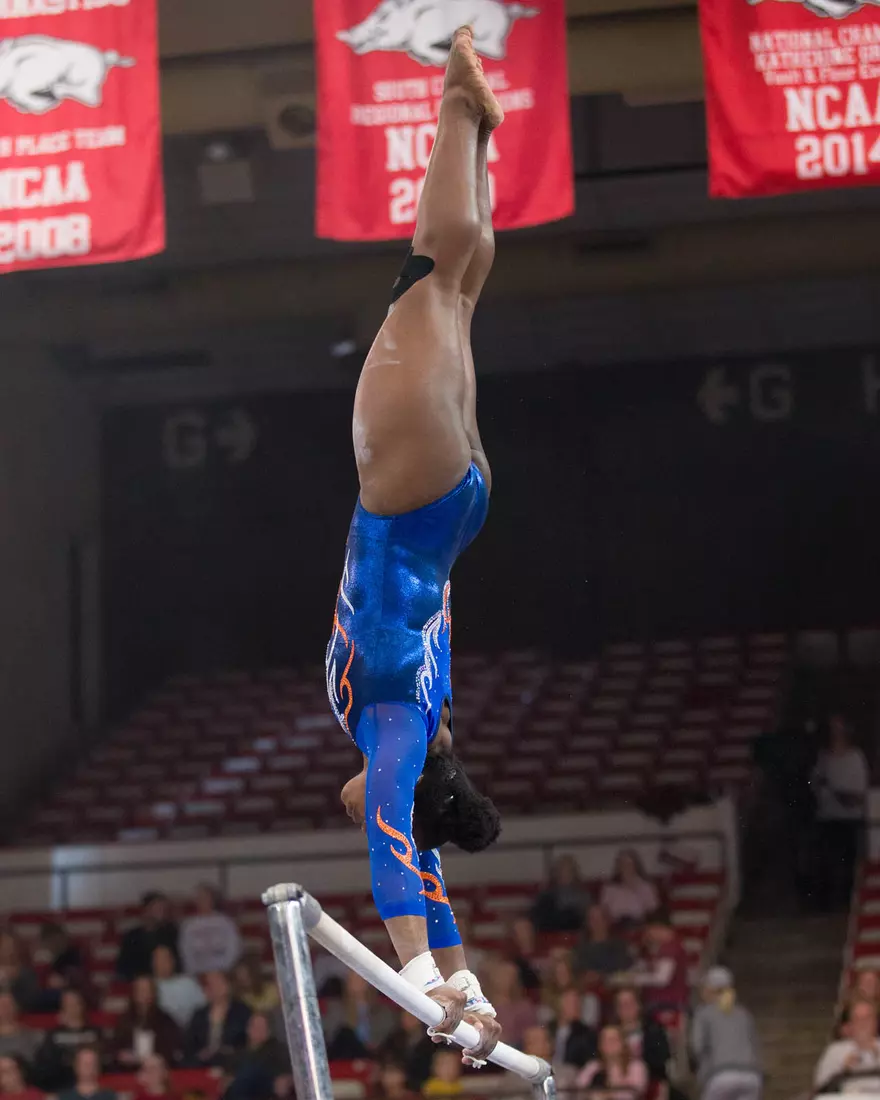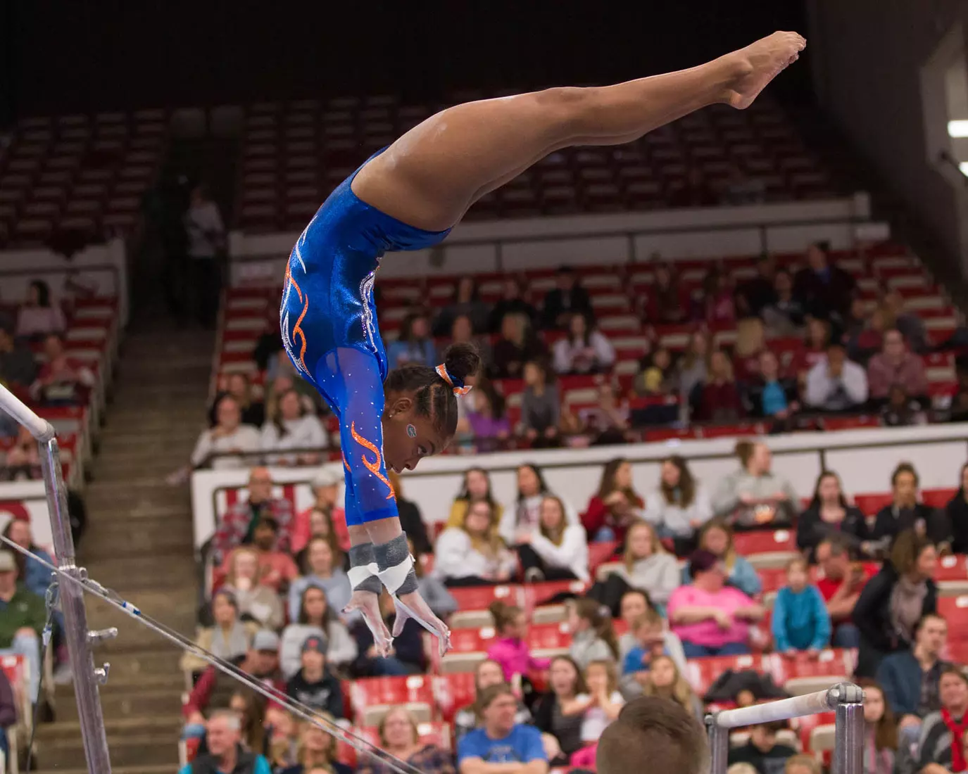Trinity Thomas led Florida on its opening event, uneven bars. Fellow freshman Savannah Schoenherr was second with her 9.90. Senior Alicia Boren anchored the Gators' vault lineup with her winning mark.