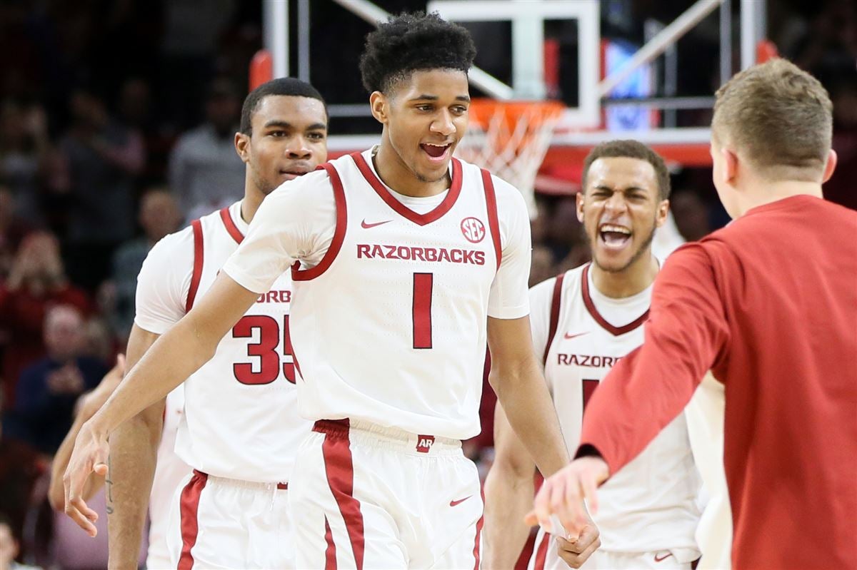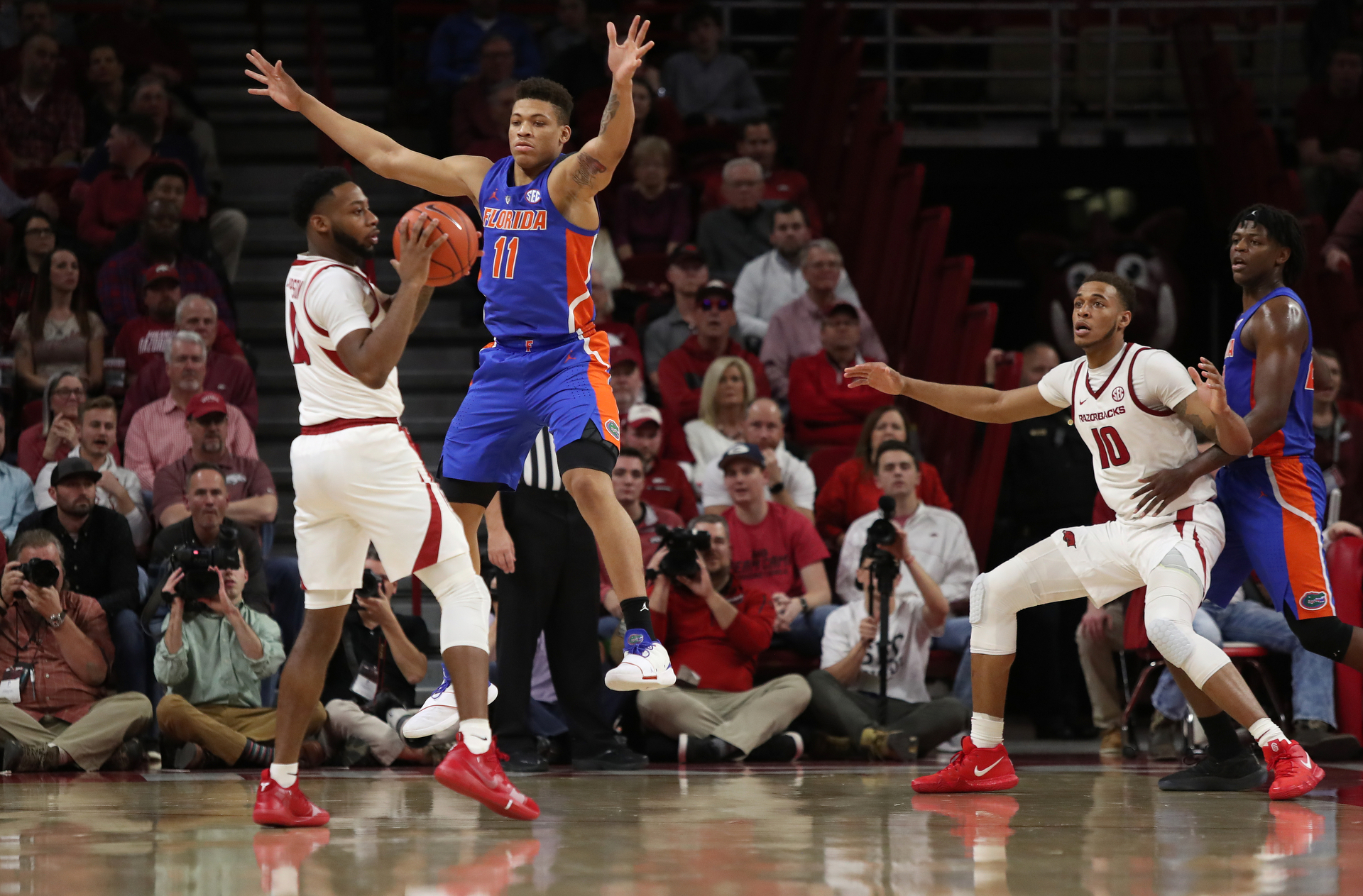not necessarily been the case this season. The Razorbacks went 4-7 on the road, including 3-6 in SEC play, and 1-1 in neutral-site games. The Hogs handed regular-season league champion LSU one of its two league losses at Baton Rouge, threw a scare into the Kentucky at Rupp Arena before falling 70-66, and last week annihilated Vanderbilt by 36 at Memorial Coliseum. ... Arkansas is sixth in the SEC in scoring offense (76.3), seventh in field-goal percentage (.449) and third in turnover margin (plus-3.5). Defensively, the Hogs give up 72.8 points per game, which is 12th in the conference, and 42.6-percent shooting overall (7th) and 34 percent from deep (8th). ... At a very sturdy 6-11, 233 pounds Daniel Gafford looks every bit the part of a forward, but he runs the floor like a guard, which is why he's being projected as first-round NBA draft pick in June. He was in foul trouble in the first meeting between the two teams, but still finished with nine points and 12 rebounds. He had 16 points, 12 rebounds and shot 8-for-11 in the SEC tourney defeat of the Gators last season, finishing the game with a memorable (or forgettable, for those on the UF sideline) run-out, windmill dunk that was replayed on ESPN countless times. ... Point guard Jalen Harris ranks fourth in the SEC in assists, but first in assist-to-turnover ratio at plus-3.1. Harris does not make many mistakes and is a very good defender, but he's also not going to beat an offense by scoring (34.2 percent overall, just 8-for-65 from 3). He is a facilitator. ... A pair of reserves, 6-5 guard Mason Jones (13.8 ppg, 3.8 rpg) and 6-6 forward Adrio Bailey (5.6 ppg, 3.1 rpg), aren't really reserves, having only become backups of late. They have a combined 50 starts between them this season. Jones, a junior-college transfer who lit UF up for a career-high 30 last time, has 70 makes from 3 this season (four that night against the Gators), which is second-most on the team, and knocks them down at better than 36 percent, which is third on the team. ... The Hogs are not a good rebounding team, as they rank last in the SEC in rebounding margin (minus-4.5) and offensive rebounding percentage (.285). Beware forward Gabe Osabuobien on the former stat, however. Of his 91 rebounds, 41 have come on the offensive end (45 percent).