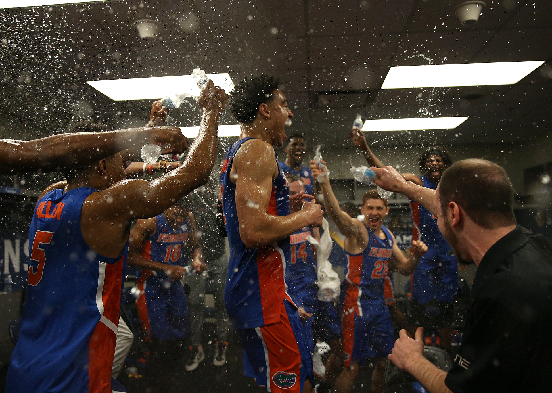 Andrew Nembhard gets the water bottle treatment in the post-game locker room celebration.