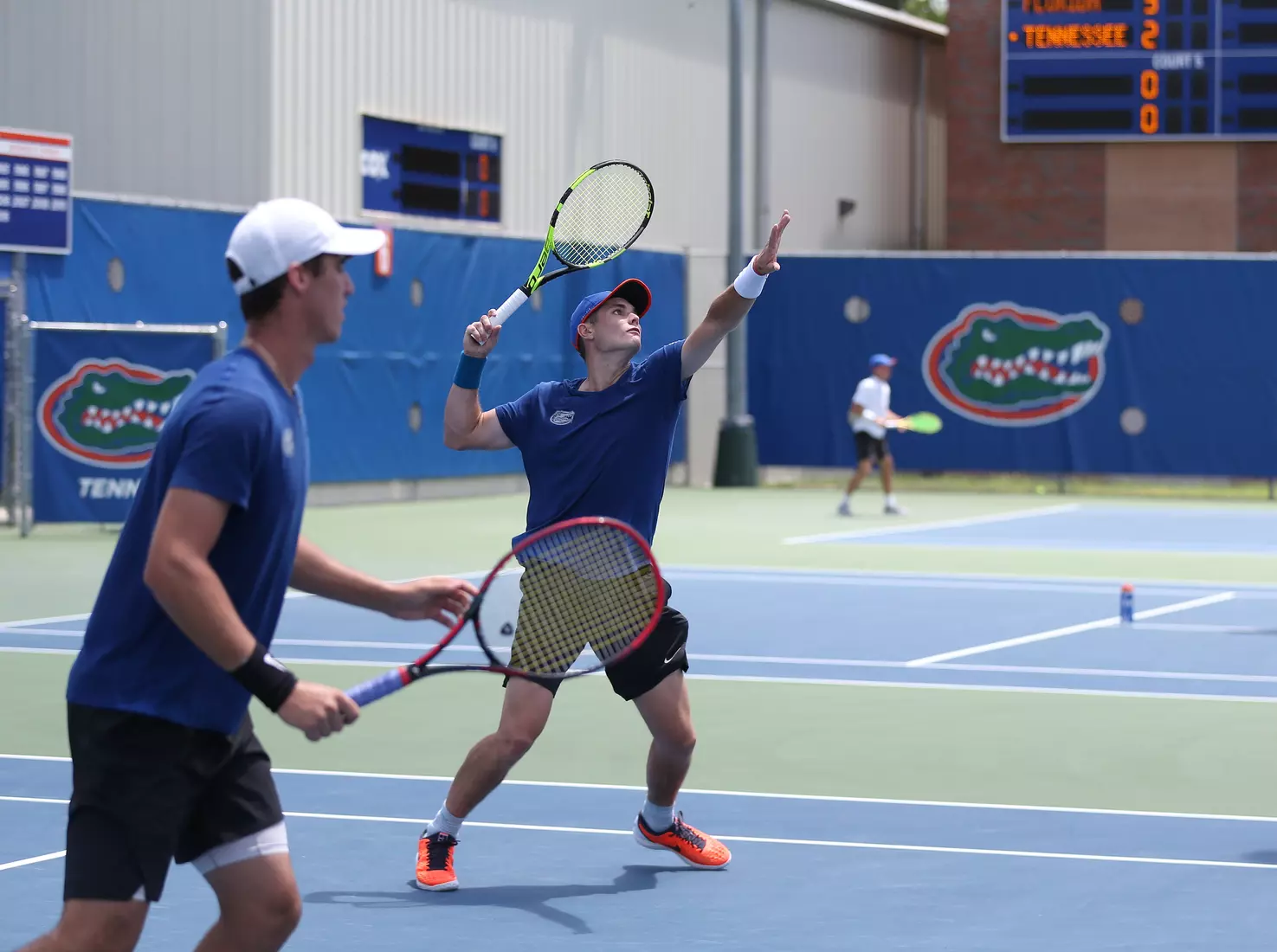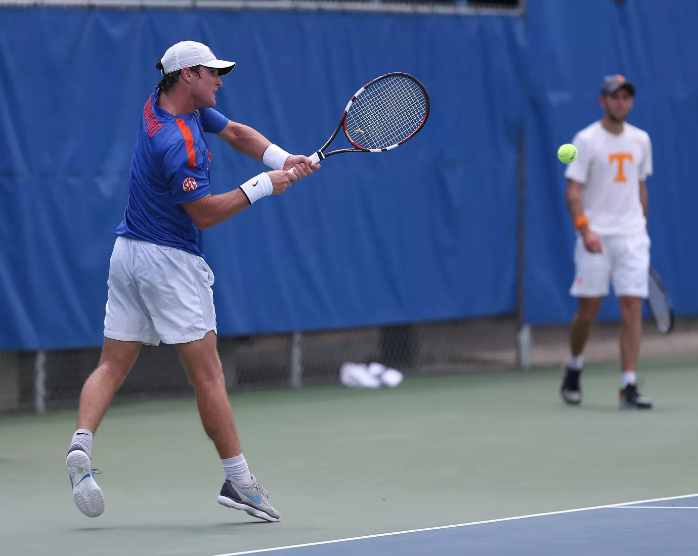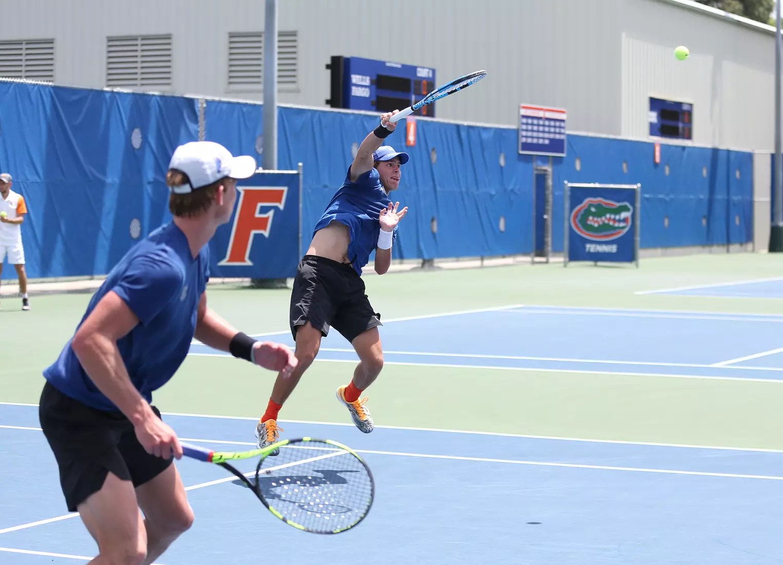 From the beginning of the match, emotions were high in the crowd and on the court. In front of the packed stands at the Alfred A. Ring Tennis complex, Vale and partner Andy Andrade did what they have lately, and that's take the doubles match on Court 3. After the Volunteers took Court 2 over Alfredo Perez and Sam Riffice, it was up to Court 1 to decide the point. Down a break, McClain Kessler and Johannes Ingildsen broke and took the lead and the match from the No. 6 ranked doubles duo and gave the Gators an early 1-0 advantage heading into singles.