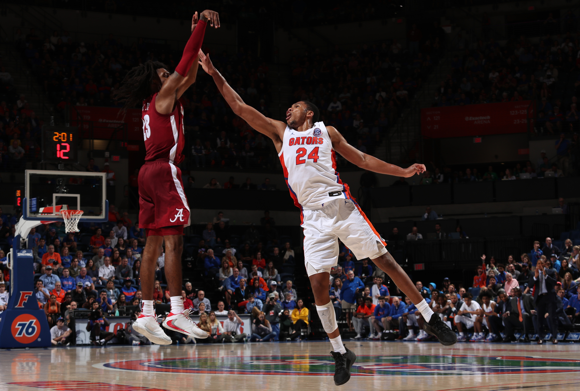 UF grad-transfer forward Kerry Blackshear Jr.(24), shown here on the defensive end against Alabama guard John Petty Jr., has been a force for the Gators on both ends. In the past three games, Blackshear has averaged 22.3 points, 12.7 rebounds and hit an astounding 33 of 36 free throws (91.7 percent). Against Alabama, he became the first UF player (and just the 10th in the SEC) to tally at least 24 points and 16 rebounds in a league game over the last 25 seasons.