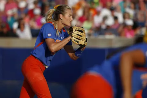 Behind a dominant performance form senior Lauren Haeger (2-for-3) at the plate and a gutsy effort from Aleshia Ocasio and Delanie Gourley in the circle, the University of Florida softball team won Game 1 of the Women’s College World Series Championship Series on Monday in front of 8,329 people at ASA Hall of Fame Stadium.