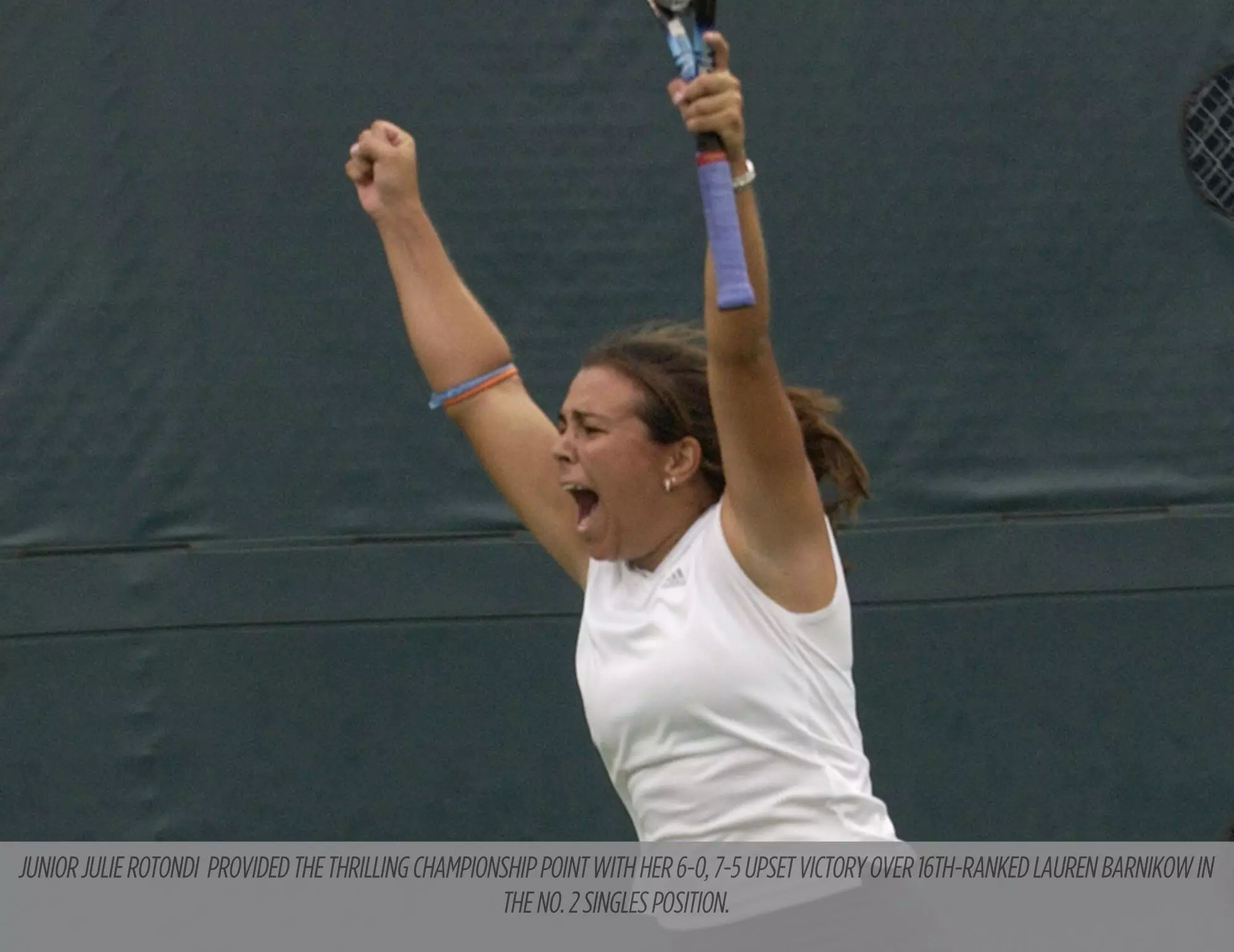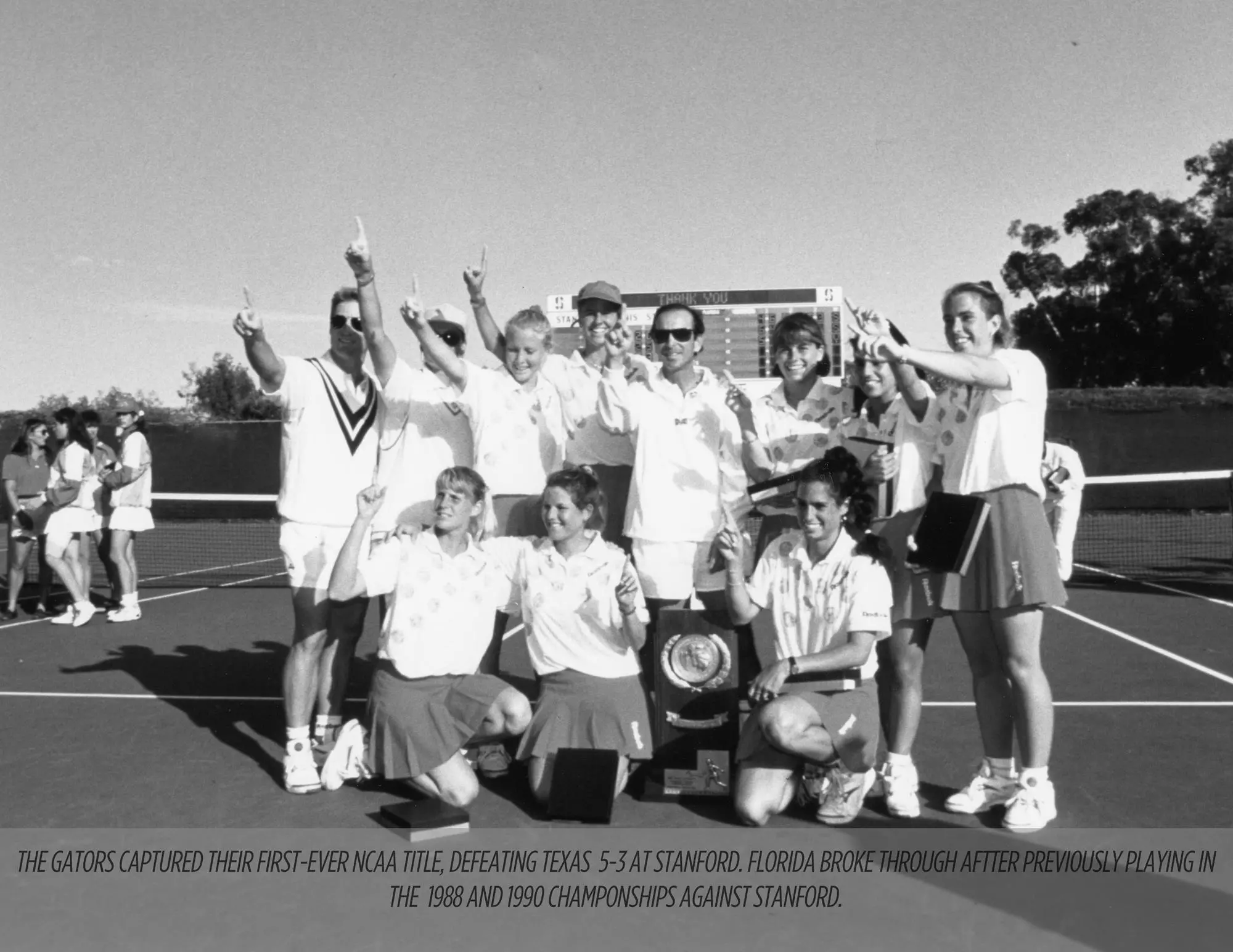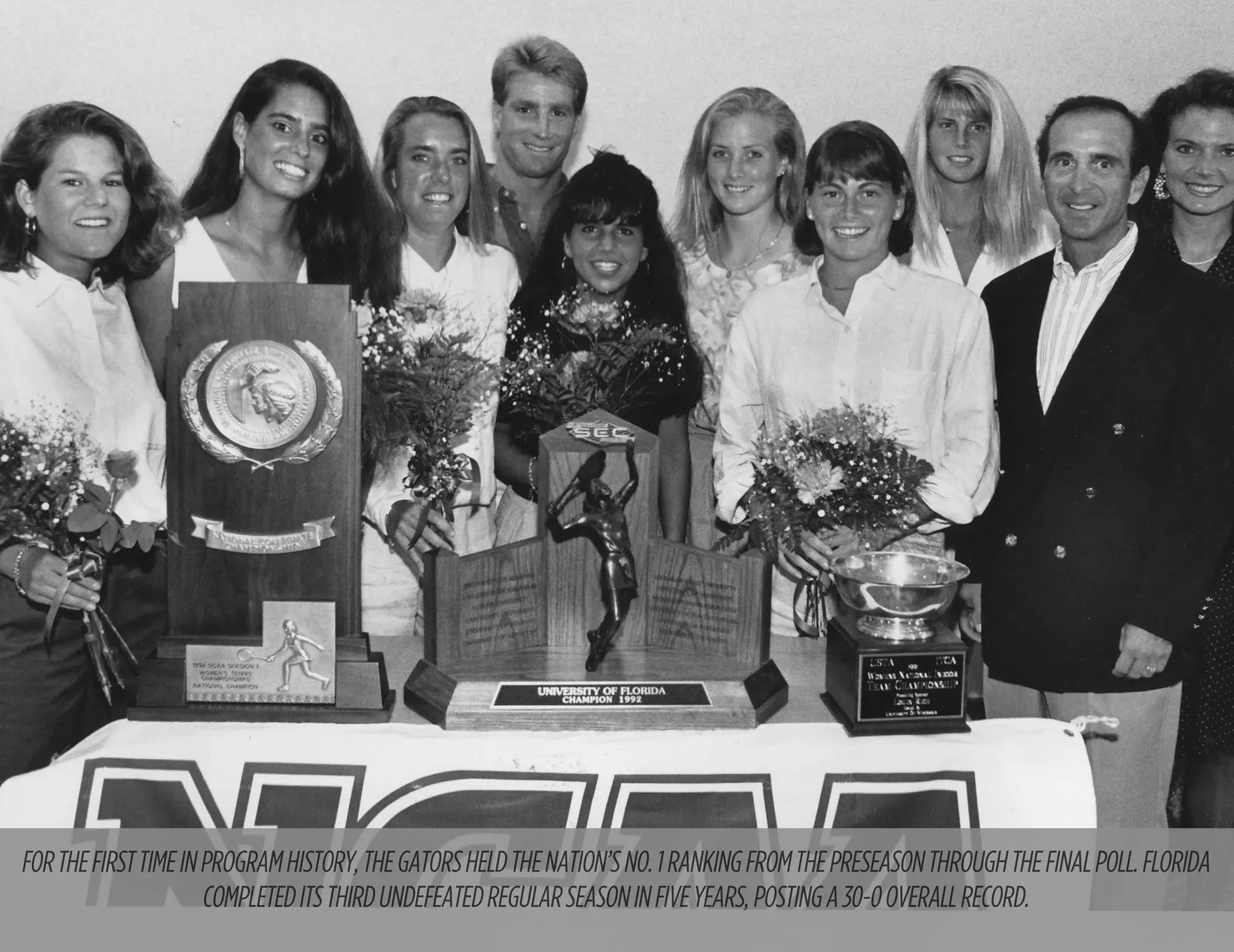 Making their third title match appearance in a five-year span, the Gators broke through for the first-ever NCAA Championship in 1992. Florida completed its third undefeated regular season in five years, but this time carried its winning ways into the postseason where it defeated USC in the round of 16, UCLA in the quarterfinals, Duke in the semifinals and, finally, Texas, 5-3, in the national championship.