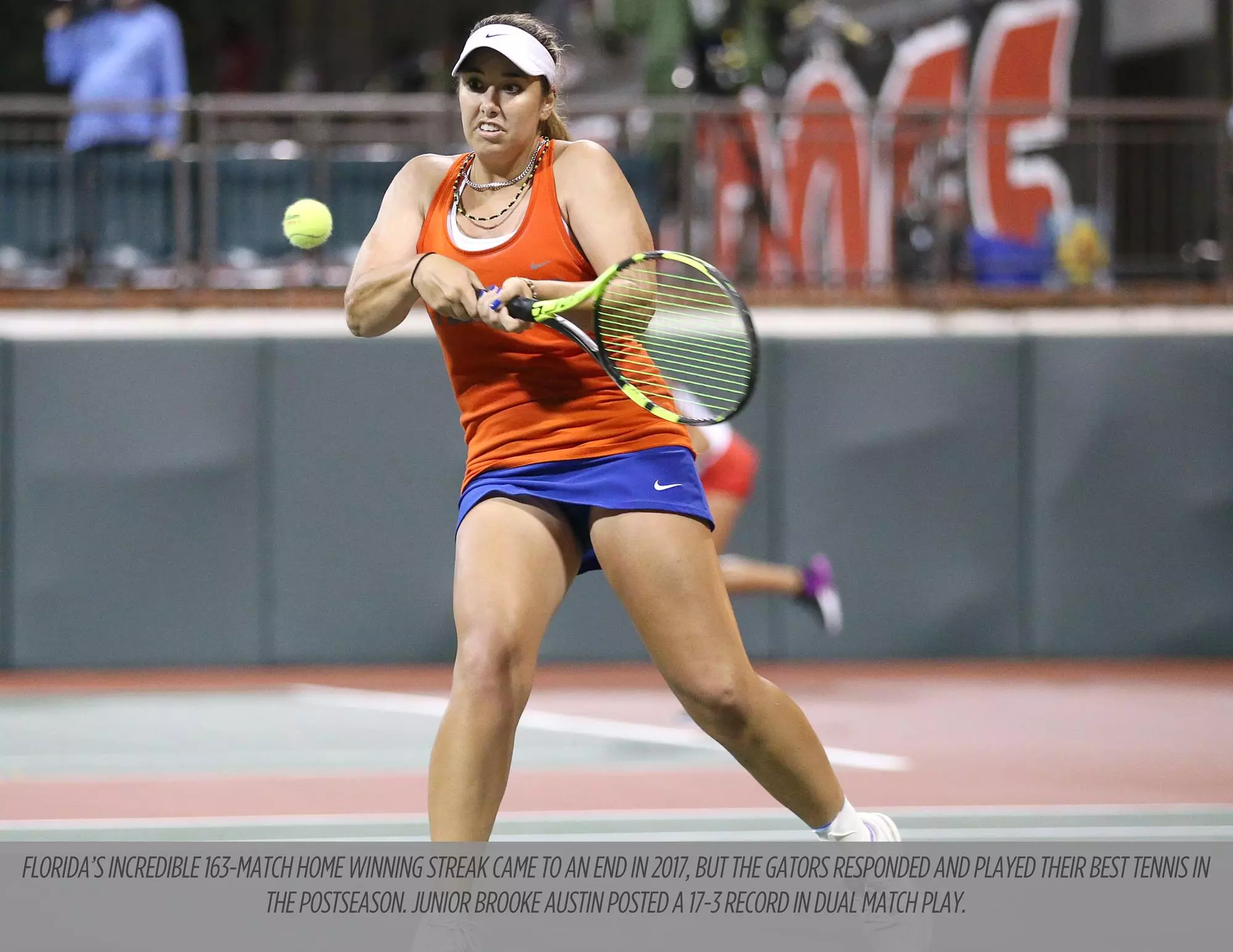 Winning 28 of their 32 doubles points, the Gators often set the tone with strong play. The doubles team of Josie Kuhlman and Woolcock capped their pairing with a 23-3 dual match record at the No. 3 position, which was the most in a season by a Gators duo at the three spot in program history.