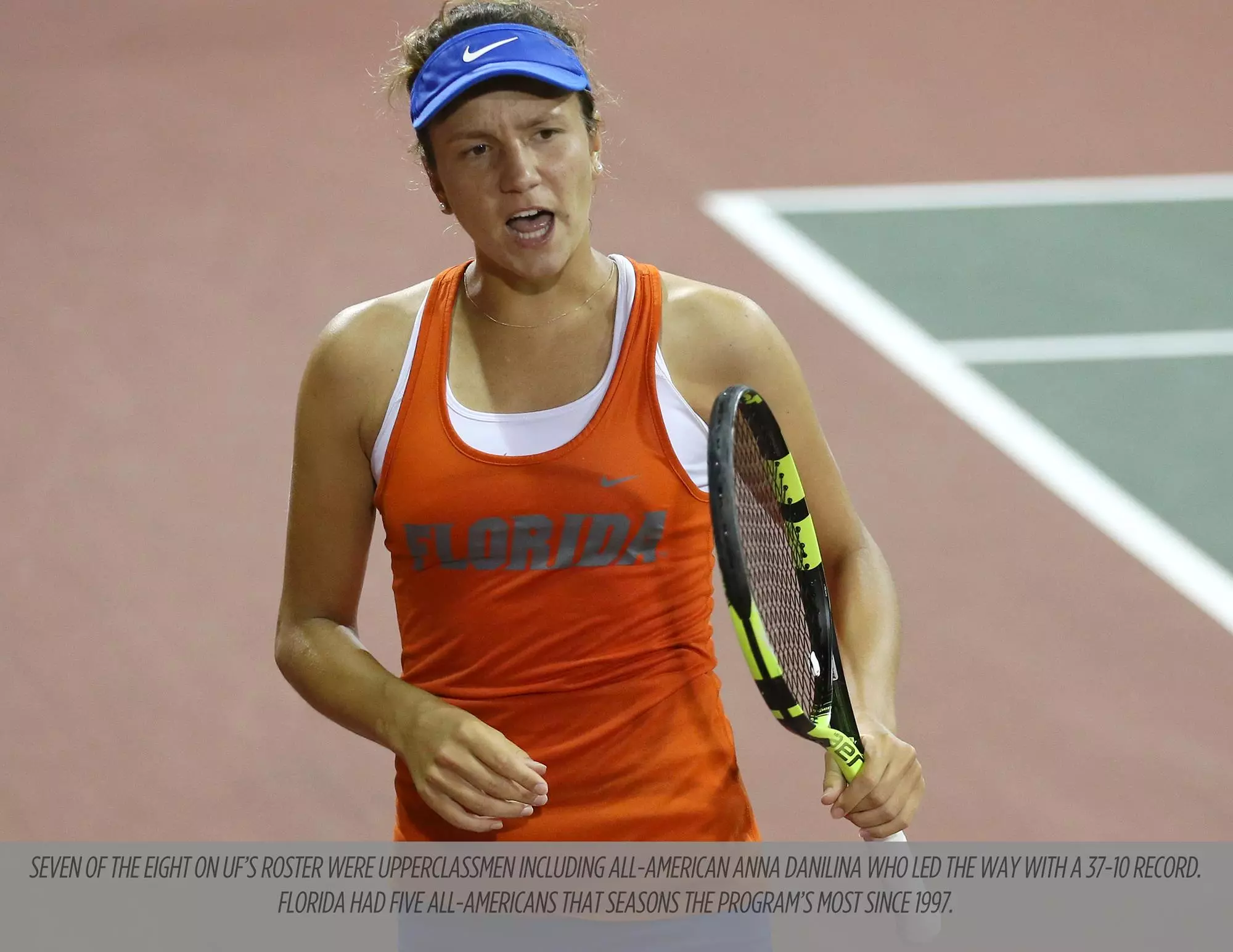 Brooke Austin, Anna Danilina, Kourtney Keegan, Belinda Woolcock and Neel all earned All-America status, as Florida finished with its most All-Americans in 10 years. The junior Danilina led the way with 37 overall wins while the senior Woolcock was a consistent contributor at the No. 1 spot in dual match play, notching 16 victories.