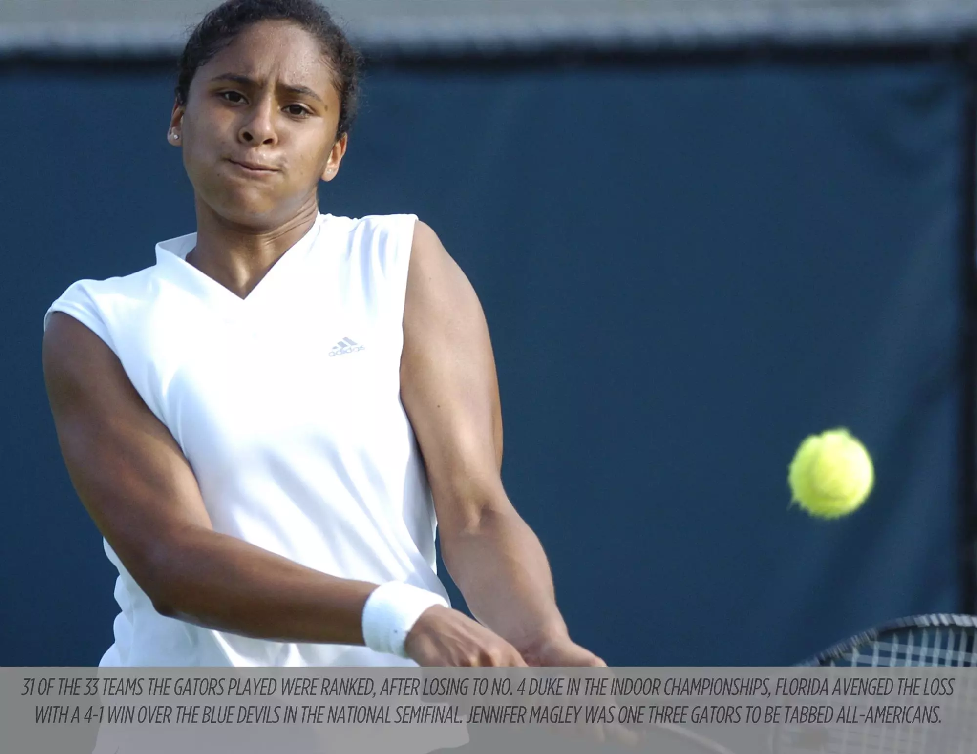 Raymond notched a program-record 50 singles wins, while Lloyd and fellow senior Kay Louthian paired up for a team-best 18 doubles victories and finished ranked No. 14 in the nation. As a team, Florida was dominant, defeating 22 ranked squads and only having two matches decided by a single point (5-4 win over Georgia in SEC Tournament Final, and 5-4 win over UCLA in National Indoor Championships in Madison, Wis.).