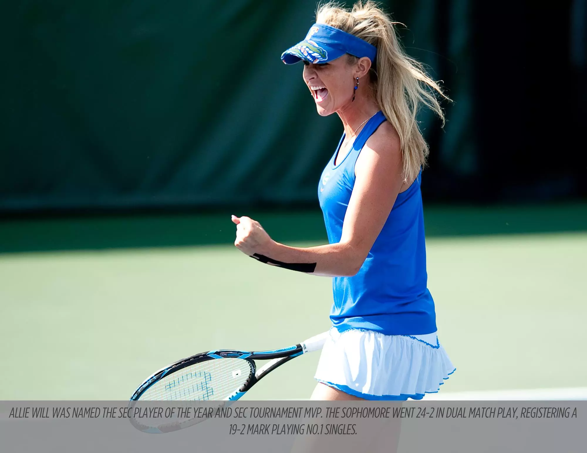 The Gators’ play at the Ring Tennis Complex epitomized the phrase home court advantage as they, for the 22nd time in program history went undefeated at home and extended their home match winning streak to 107 (the longest active streak by any NCAA Division I women’s team in any sport at that time). The veteran-driven Florida unit was again led by juniors Allie Will and Embree, who both saw time at the team’s top spot in singles. Will finished 17-2 in dual match play while Embree posted a 22-2 mark and was tabbed SEC Player of the Year for the second time.