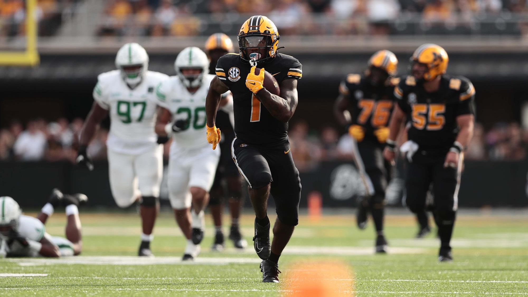 Missouri tailback Tyler Badie (1) leads the SEC in rushing with 1,232 yards, plus a dozen touchdowns.