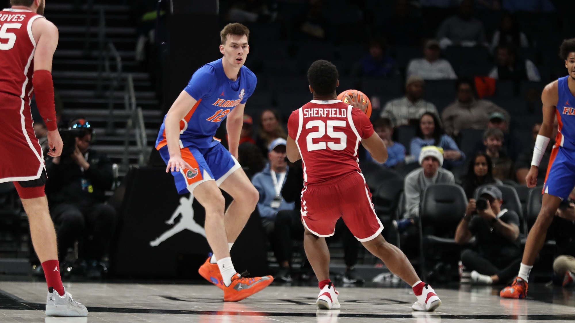 OU guard Grant Sherfield (25) was a problem forColin Castleton (12) and the Gators on his to 22 points and four 3s.