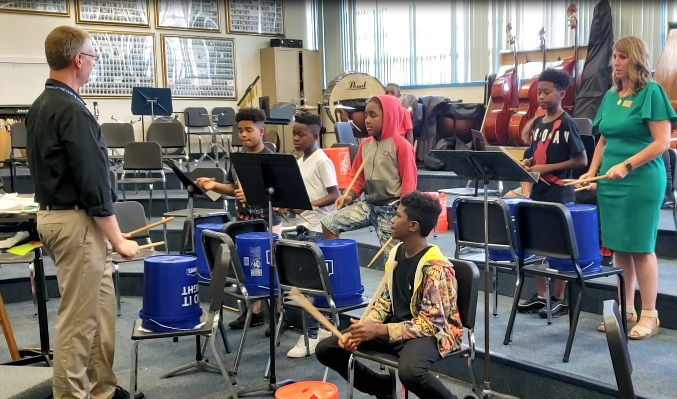 Todd Eckstein (left), the 2022 Alachua County Public Schools' Teacher of the Year, in action with his Lincoln Middle School drumline class.