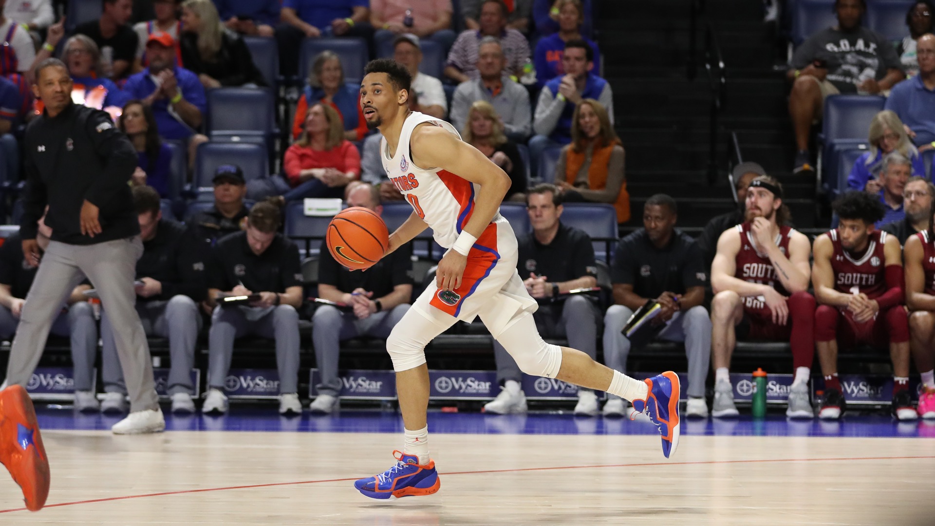 Myreon Jones was in complete control Wednesday night on his way to nine points and career highs of 10 rebounds and eight assists in the Gators' win over the Gamecocks.