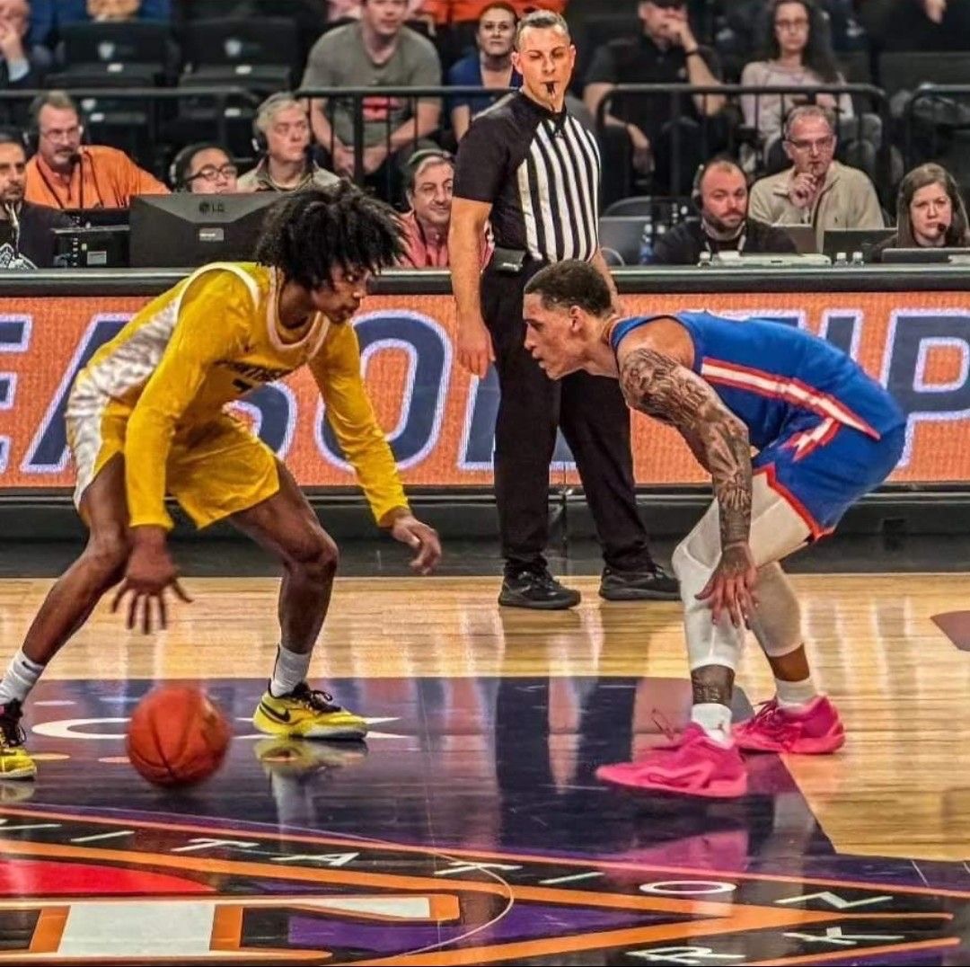 Pittsburgh point guard Carlton Carrington (left) had a tough night dealing with Riley Kugel in UF's win at Brooklyn.