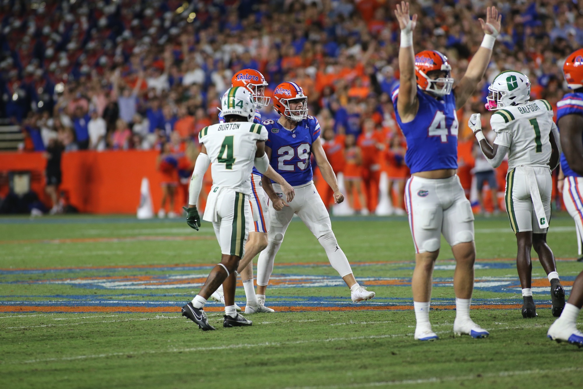 WHAT HAPPENED: On a night the Florida offense was held to a single touchdown, sophomore placekicker Trey Smack picked his team up by making five field goals, including a 54-yarder, and the 25th-ranked Gators did enough to a put a 22-7 victory in the books before a sellout crowd at Spurrier/Florida Field. The win, not to mention the atmosphere, was a far cry from a week ago when UF upset 11th-ranked Tennessee in one of the most electrifying nights in the "Swamp" in years. But when it was over the Gators had their first three-game winning streak under second-year Coach Billy Napier, as well as the program's first since winning six straight during the 2020 season. Redshirt junior quarterbackGraham Mertz, the transfer from Wisconsin, passed for 259 yards and a touchdown, while the tailback tandem of juniorMontrell Johnson Jr. and sophomore Trevor Etienne combined for 111 yards on the ground and senior wideout Ricky Pearsall caught six passes for 104 yards, as the Gators did a lot of moving the ball between the 20s, but struggled to find the end zone. UF opened the game with a bunch of energy and its lone touchdown drive to match. After forcing a punt and starting on their 5, the Gators went 95 yards in nine plays with Mertz hitting redshirt freshman tight end Arlis Boardingham for a 6-yard scoring pass, the first TD of Boardingham's career. After that, the Florida offense moved the ball but stalled each time it threatened in Charlotte territory. UF was stopped inside the 49ers' 10 twice and again at the 28, with Smack nailing field goals from 27, 23 and a career-high 54 yards to put his team ahead 16-0 in the second quarter. Charlotte capitalized on UF's inability to finish drives by making it close with a scoring march of its own. Quarterback Jalon Jones, once a UF signee, hit a 50-yard completion before running through UF arm-tackle attempts on a third-and-goal for a 7-yard touchdown that cut the lead to 16-7 to cap the first-half scoring with 2:30 to go before intermission. Florida took the opening drive of the second half, reached the Charlotte 20 and again was turned back. Smack's 36-yarder made it 19-7 midway through the third quarter. That's how things stood over the sloppy balance until, one last time, UF failed to convert a third-and-1 at the Charlotte 6 and called on Smack, whose fifth field goal, another chip shot from 23, wrapped the scoring with 2:28 to play. Mertz finished 20 of 23 (that's 87 percent) for the game and UF totaled 395 yards of offense to Charlotte's 210. Smack's field goals were the third-most in a game in program history.
