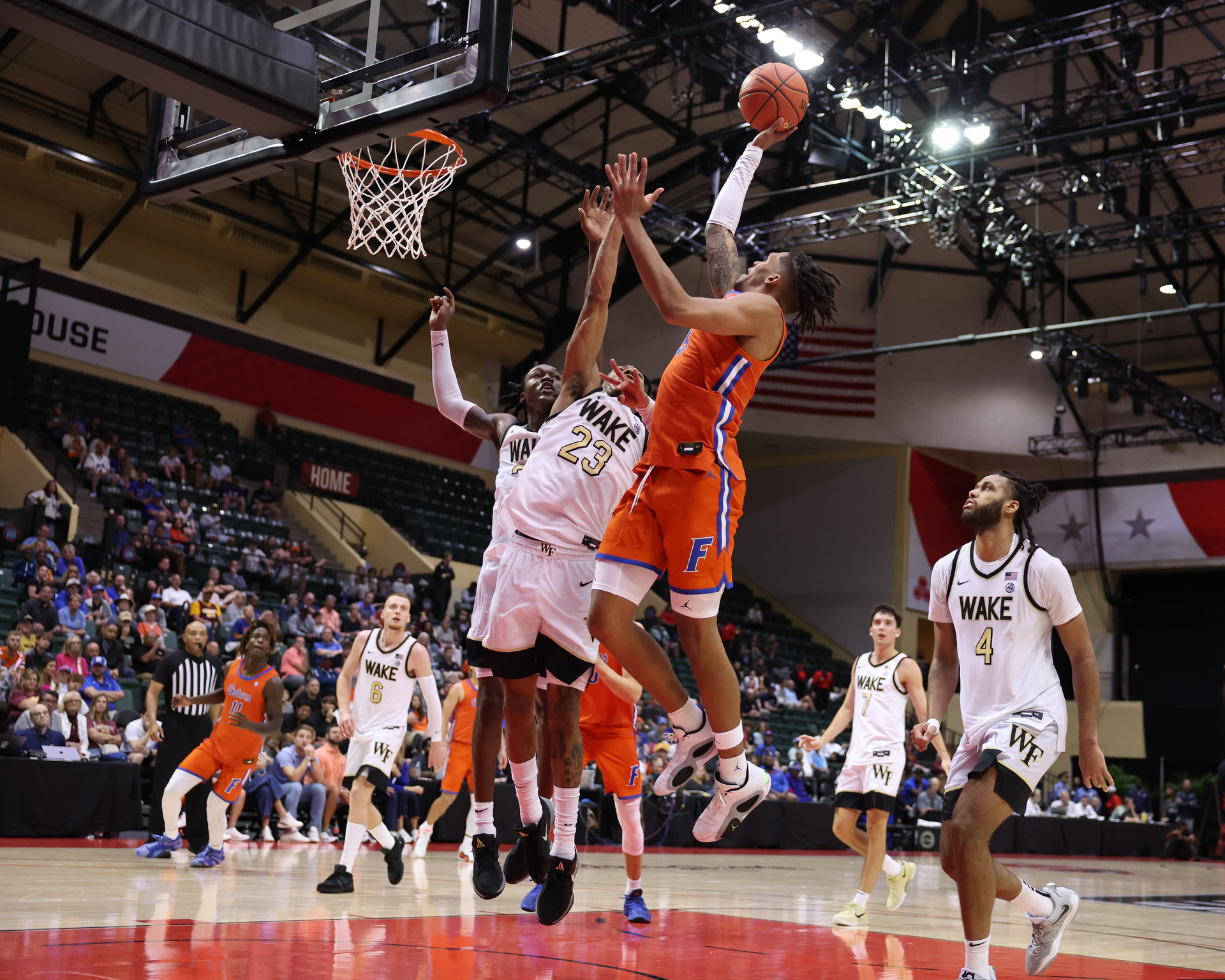 The second half started with a UF flurry, a rarity for the team in the early season. Clayton hit back-to-back 3s to quickly push the margin to 10. A Condon layup made it a 12-point lead. Then, on an inbound out-of-bounds play beneath its basket, Wake tried to throw the ball to midcourt to get it in play. That's where Martin flexed that "physicality" he spoke about. Martin had his man blanketed, tipped the ball ahead to himself, gathered it and outraced the Deacons for a wicked dunk that forced Forbes to call a timeout, with the Gators on a 10-point run and his team 0-for-4 to start the half, suddenly down by 14.