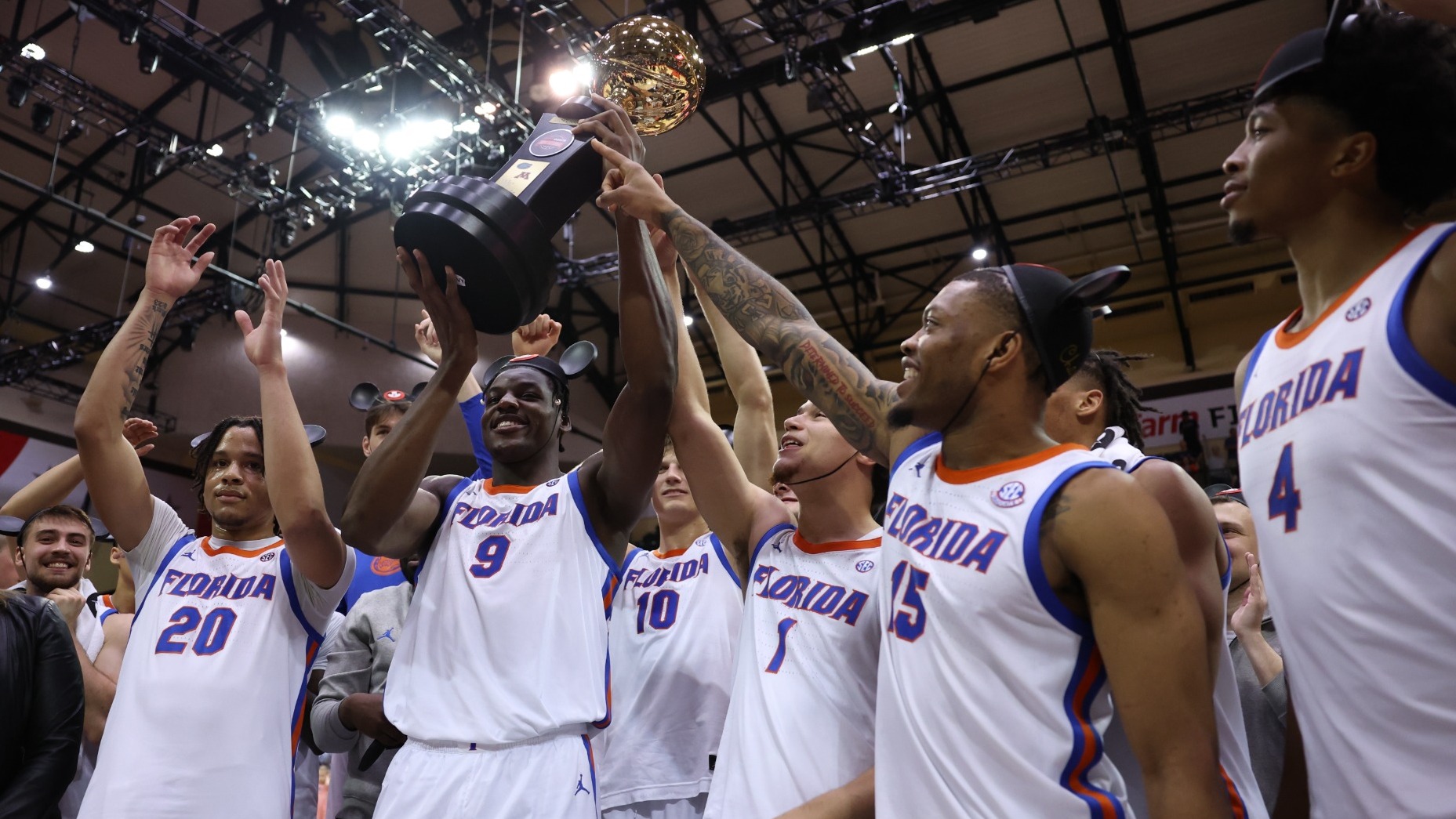When it was over, the Gators mugged at midcourt with Mickey Mouse caps and hoisted the tournament championship trophy as a cannon of confetti rained down on the winners.