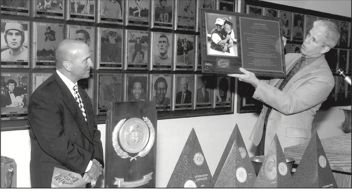 UF athletic director Jeremy Foley (right) presents Andy Brandi (left) with his "Gator Great" plaque during his 2006 induction into the UF Athletics Hall of Fame.