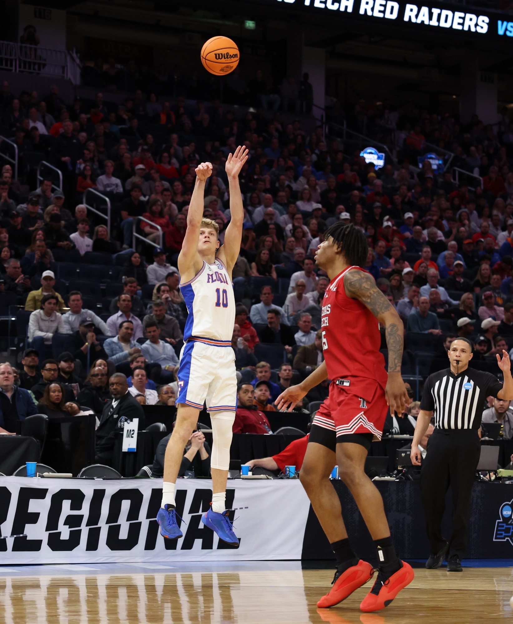 Thomas Haugh (10) bombed four 3s, including two clutch ones during the late-second half comeback, on his way to a 20-point, 11-rebound double-double in UF's defeat of Texas Tech in the NCAA West Region title game last March 29 at San Francisco. His dedication to working in the gym showed up in his freshman year (25.4% from 3 and 46.7% from the free-throw line) to sophomore season (34.0 from 3 and 79.4 at the line).