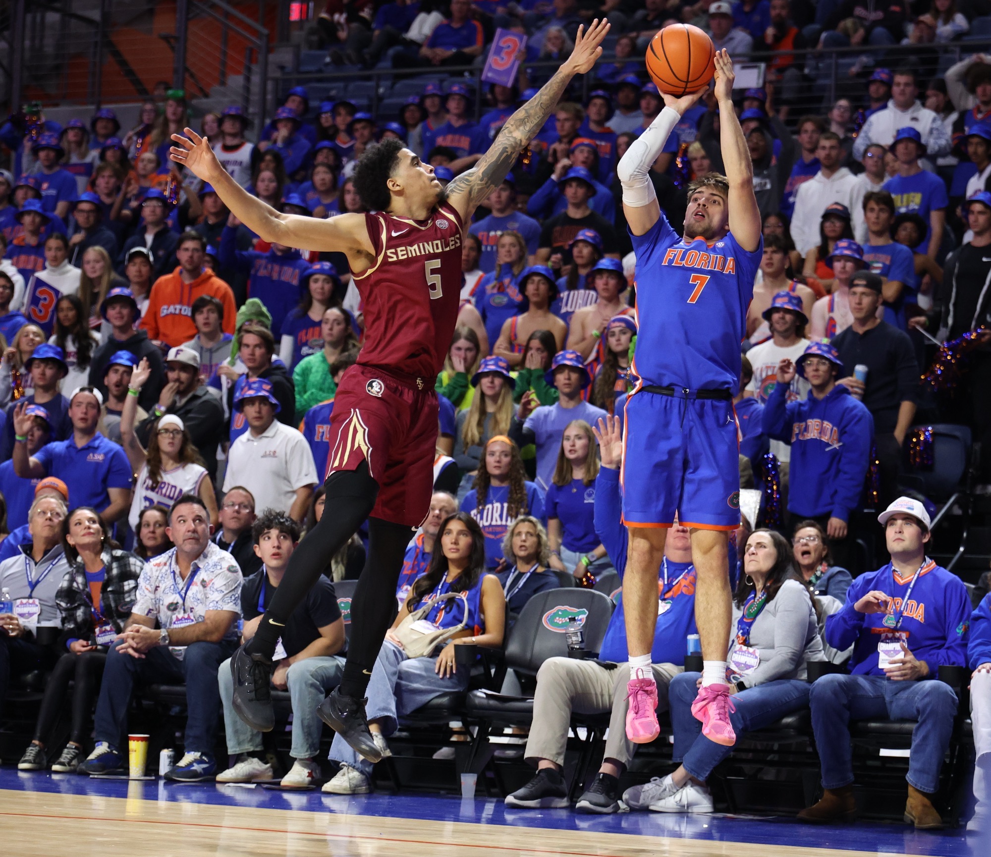 Sharp-shooting backup guard Urban Klavzar(7) has hit just three of 14 attempts from distance, but this make with a minute left in the FSU was a huge and gave the Gators a four-point lead.