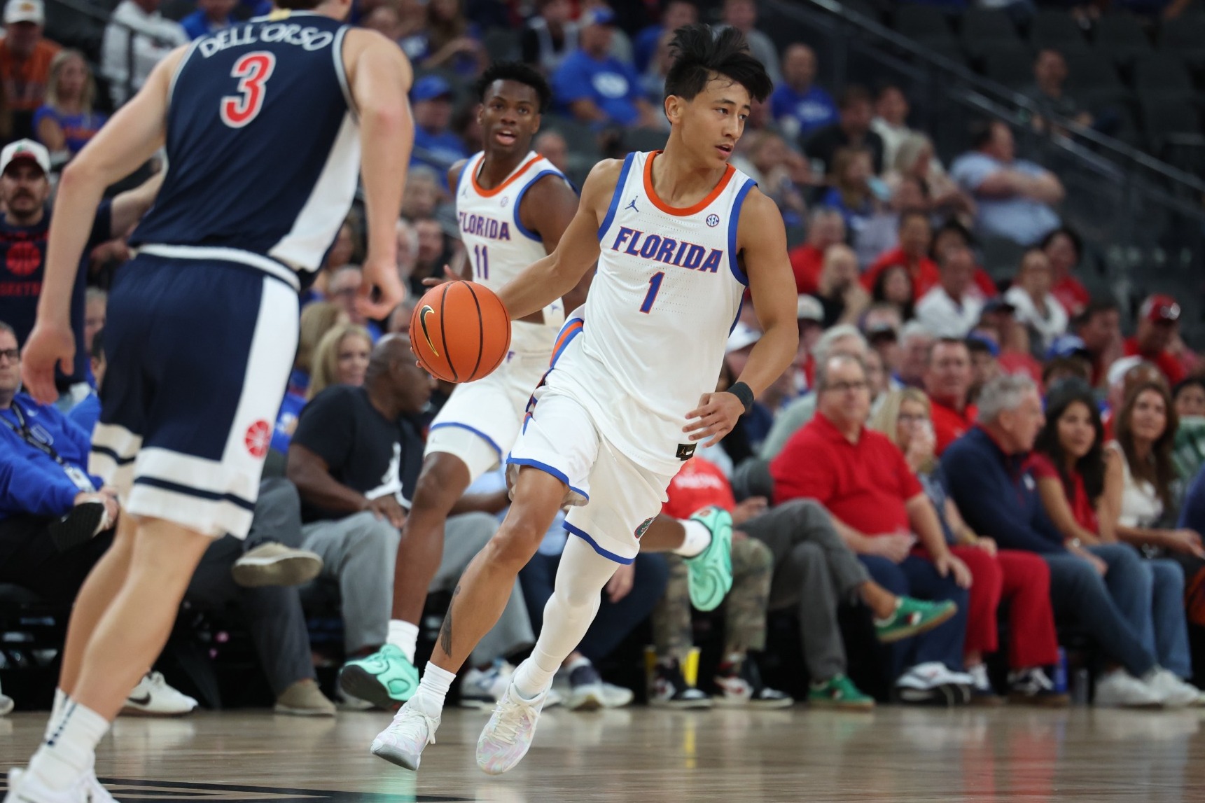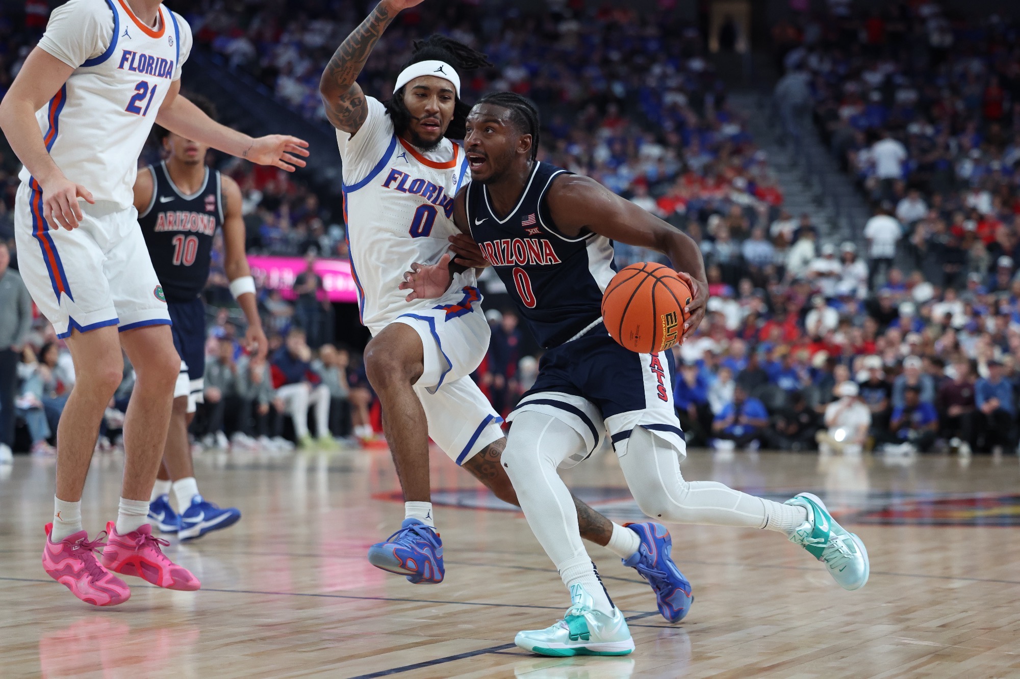 Arizona point guard Jaden Bradley (0) was on the attack all game against the Boogie Fland (0) and the Gators on his way to 27 points.