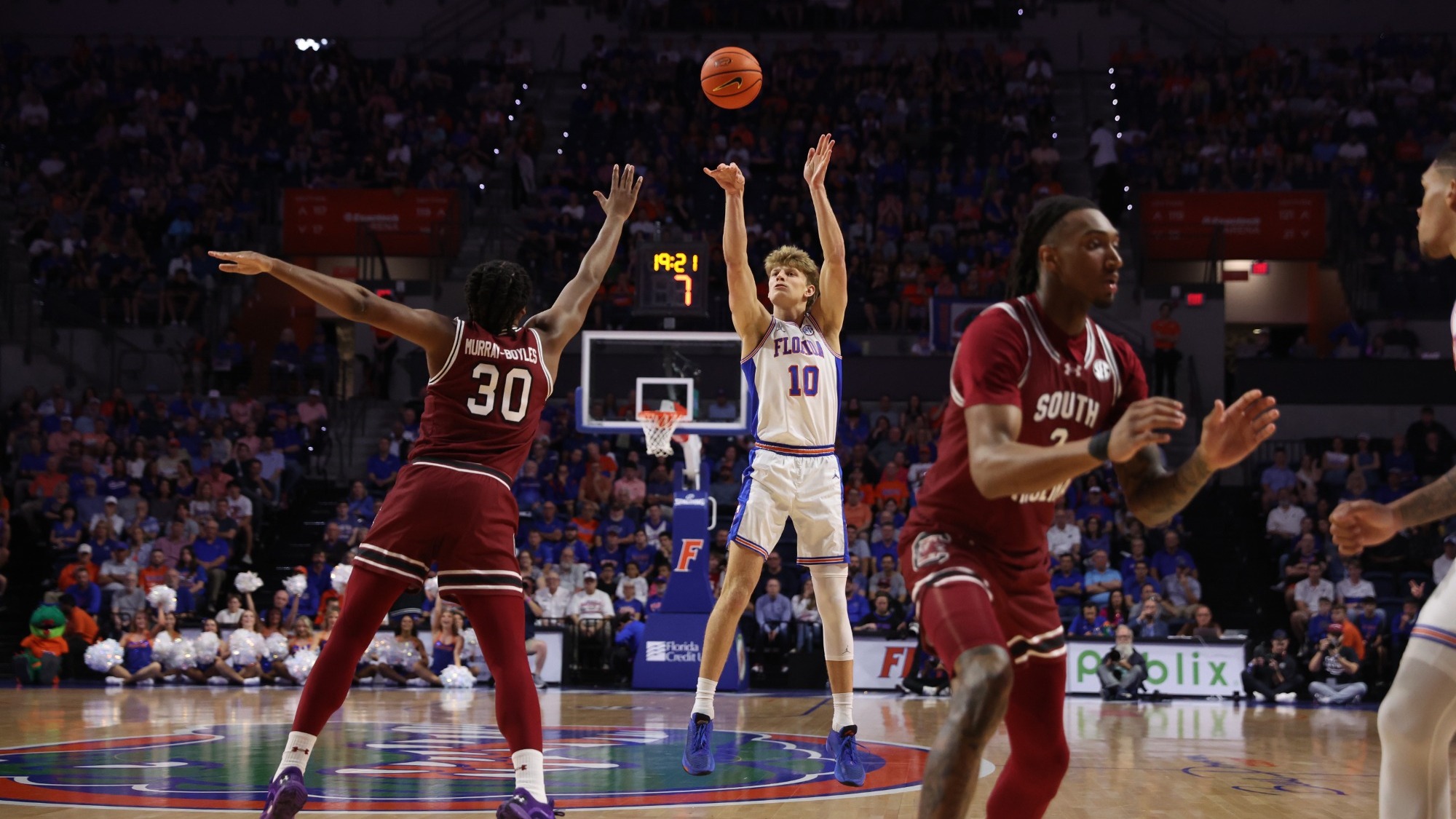 The Gators had to shake a sub-standard first half -- they led by just four at intermission against a Gamecocks team that was winless in SEC play -- by shooting 70.4 percent and dropping eight 3s after intermission. They did it minus Condon and backup forward Sam Alexis (ankle), but welcomed fifth-year guard Alijah Martin back into the rotation after he missed the previous two games with a hip pointer, and 7-foot-1 center Micah Handlogten in his first action since breaking his leg last March 17 in the SEC Tournament. Martin, the team's second-leading scorer, finished with 11 points and three assists in 24 minutes. Handlogten had two points, three rebounds, a career-high five assists, two steals and two blocks in 20 minutes.