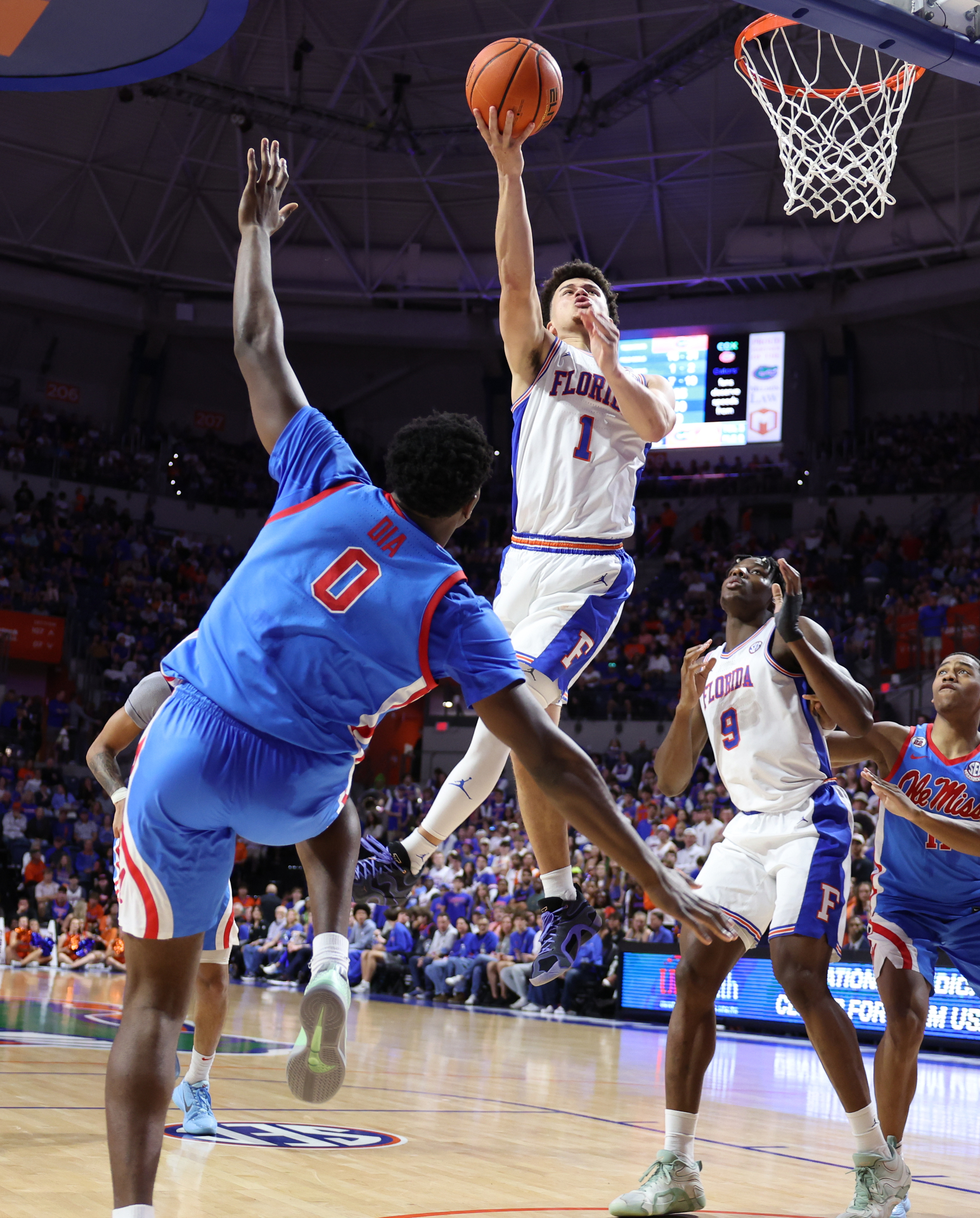 Forward Alex Condon was named to All-SEC third team after completing a week when he averaged 22.0 points, 12.5 rebounds and made four of seven from the 3-point line in two big victories. The wildly athletic and hard-playing Australian has caught the attention of NBA scouts and is now showing up on draft boards, with a couple showcase tournaments to further his individual cause. As for the team, "Condo" just needs to keep doing what he's doing (half of his rebounds against conference opponents have come on the offensive end), but also improve on his 57.1% at the free throw line in SEC play, where he's visited a team-high 70 times. ... Center Rueben Chinyelu, who grabbed a game-high 11 rebounds in the win at Alabama, is shooting 59.8% against SEC teams. ... In the two games since Condon returned to the starting lineup, sophomore forward Thomas Haugh (9.0 ppg, 6.1 rpg) has scored 19 points, made all his 2s, gone three of seven from 3, grabbed eight rebounds and dished seven assists. ... The tournament will probably provide an extra emotional jolt for reserve 7-1 center Micah Handlogten (2.4 ppg, 5.6 rpg), whose outstanding '23-24 season ended with a broken leg in the first two minutes of the championship game. In his seven games since foregoing his medical redshirt season, Handlogten is rebounding at 21% on the defensive end and 17.7 on the offensive end in his 14.6 minutes per game. ... Junior backup guard Denzel Aberdeen (8.0 ppg) only hit one shot against Ole Miss, but it was a 3. When Aberdeen makes a 3, the Gators are 19-0. When he doesn't make one, the team is 7-4. ... Since finding his way into the regular rotation (if only for limited minutes), reserve guard Urban Klavzar (3.8 ppg) has a field goal in all 10 games and a 3-pointer in eight of them. He's at 46.2 from deep in SEC play.