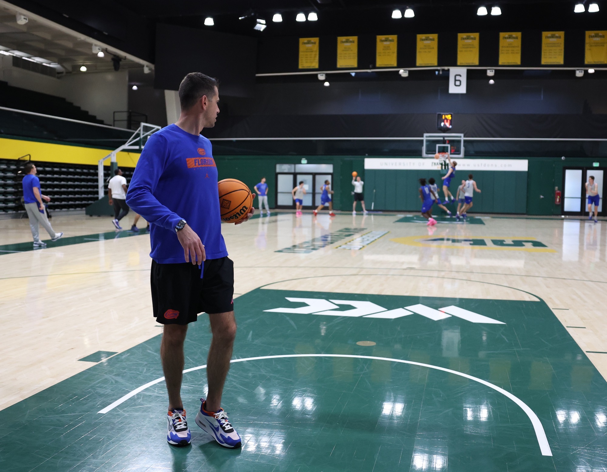The Gators walked into Sobrato through the building's new museum hall – complete with memorabilia from the Bill Russell back-to-back national championships of 1955-56 – and entered the gym where a handful of familiar faces greeted Golden, along with UF staffers Kevin Hovde, John Andrzejek, Jonathan Safir and Lopez. Together, the five combined for 18 seasons with the Dons.