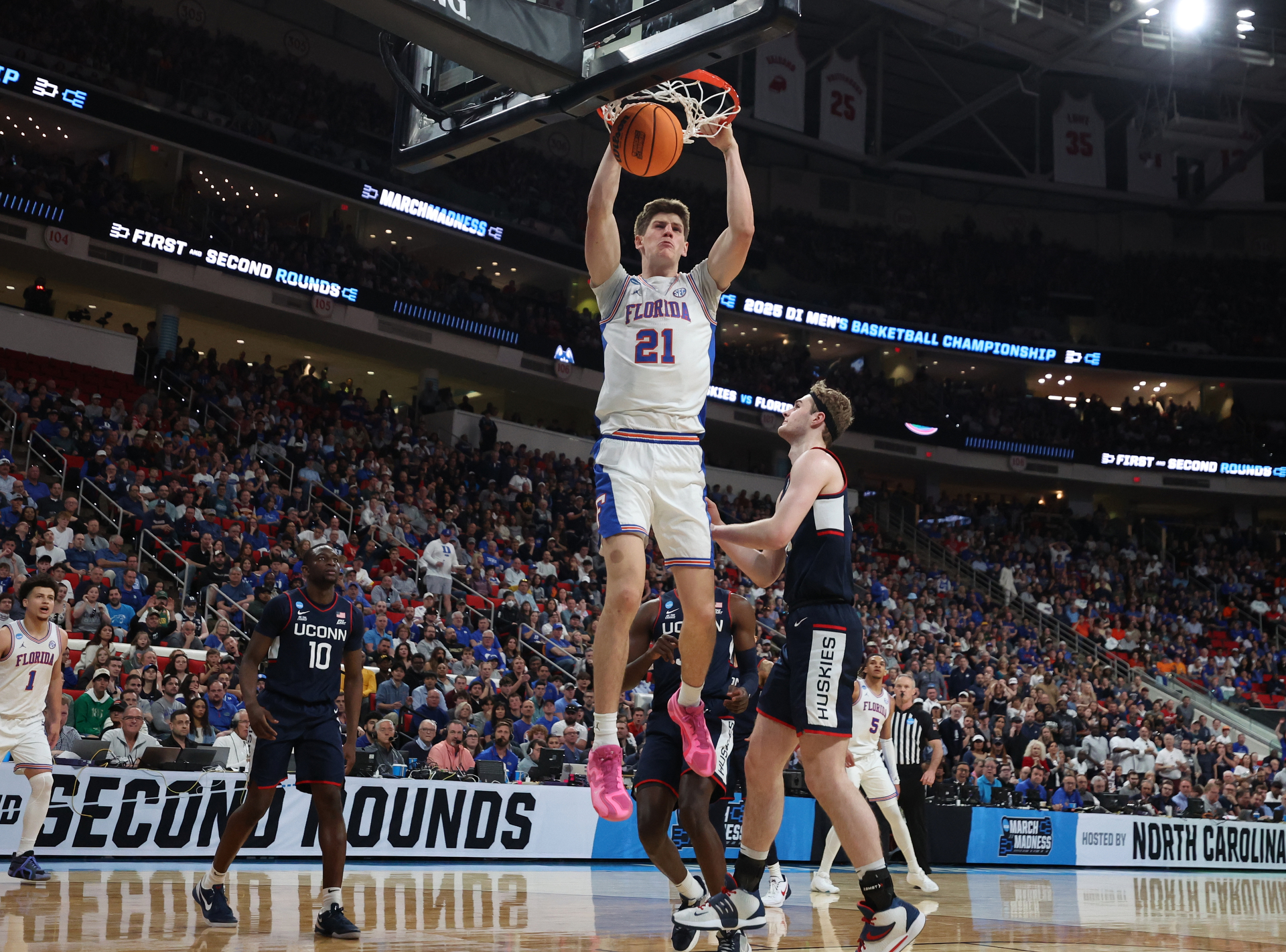 All-SEC forward Alex Condon scored just five points against UConn and missed five of his eight free throws, but battled for seven rebounds and also dished four assists. After a run of games when he's struggled somewhat with physical front court players, Condon will be tested again by a very strong and athletic Maryland post game. ... Center Rueben Chinyelu will be fine with the physicality, but needs to be more disciplined with his fouling. He was hit with three in the first half Sunday and fouled out in the SEC Tournament against Alabama. He's 13.9 offensive-rebound percentage ransk 44th in the country. ... Reserve forward Thomas Haugh (9.4 ppg, 5.9 rpg) went five of six from the 2-point area, 0-for-7 from 3 in Raleigh, but also crashed the glass for 16 rebounds and had seven assists. ... Backup center Micah Handlogten (2.7 ppg, 5.5 rpg) did not score against UConn, missing all three of his shots against the active and athletic Huskies. He finished with four boards, but a minus-4 in the box score, one of only two Gators on the negative side. The other was backup guard Denzel Aberdeen (7.9 ppg), who scored three points on three shots in his 14 minutes at minus-1.