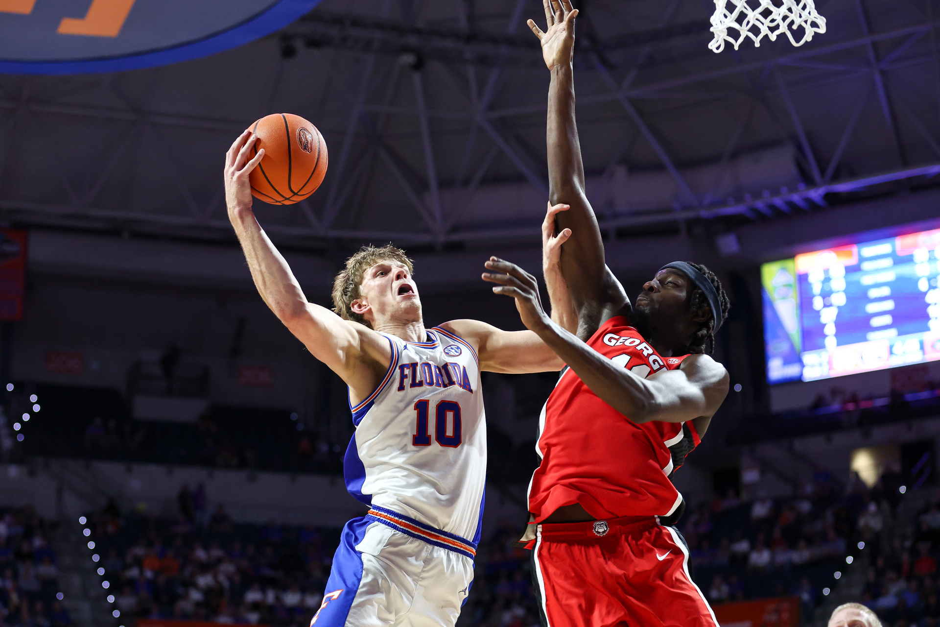 Georgia's 6-foot-11, 260-pound sophomore center Somto Cyril, who came in averaging 10 points on 81% shooting, 6.4 rebounds and league-leading 2.8 blocks a game, was ejected with 10:14 to go in the first half for throwing a punch at Chinyelu and the Gators leading just 22-21. UF, though, could not immediately take advantage of his absence, as the two teams played even to halftime, with the Gators leading just 41-40 at the break, and the Bulldogs scoring a dozen points off seven Florida turnovers.