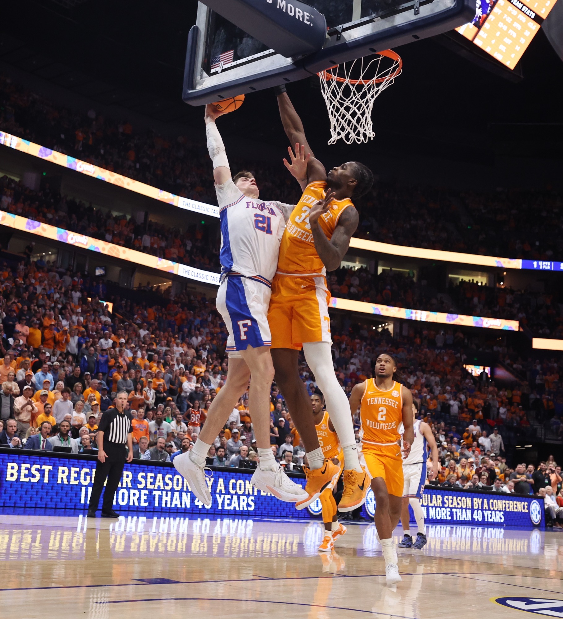 UF forward Alex Condon(21) goes right at UT center Felix Okpara (34) during the Gators' win over the Volunteers in the 2025 SEC Tournament championship game last March in Nashville.