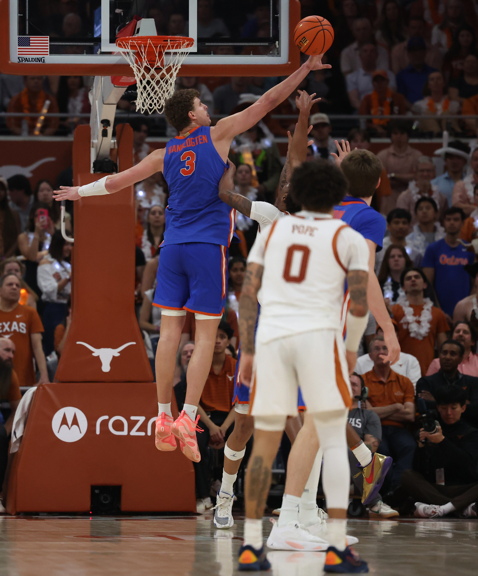 UF center Micah Handlogten (3) challenges a Texas drive at the rim.