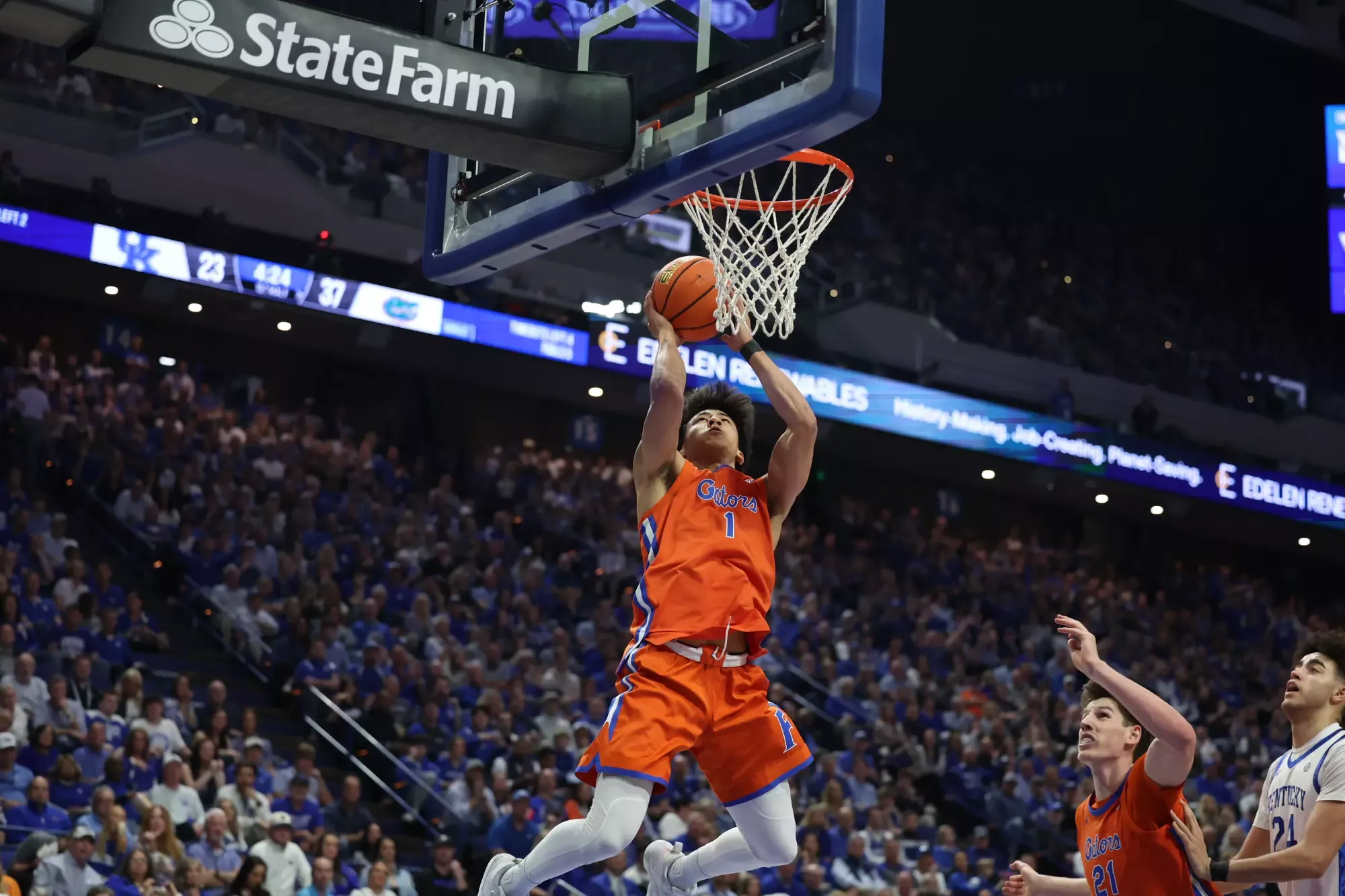 The Gators scored the game's first 11 points, withstood a couple scoring droughts that allowed the Wildcats to close within a point, at 20-19, but then dropped a run of 13 straight to break things open and eventually take a 49-32 lead at the half. UF hit 11 of its final 13 shots of the period to check in at 64%, including six of 10 from the arc, while defending UK at 38%.